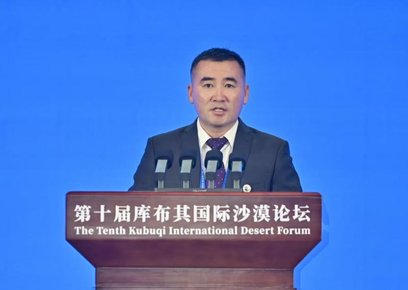 9月16日,蒙古國(guó)政府直屬國(guó)家林業(yè)局局長(zhǎng)賓·奧云薩那在第十屆庫(kù)布其國(guó)際沙漠論壇開幕式上致辭。草原云·內(nèi)蒙古新聞網(wǎng)記者 馬建兵 攝