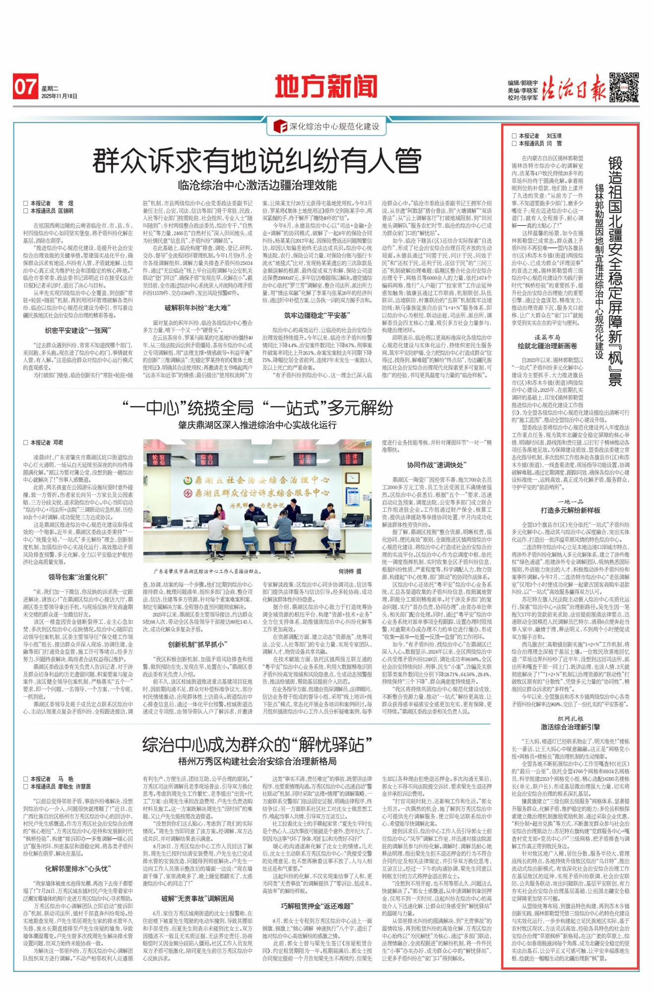 2025年11月18日《法治日?qǐng)?bào)》第7版刊發(fā)了《鍛造祖國(guó)北疆安全穩(wěn)定屏障新“楓”景 錫林郭勒盟因地制宜推進(jìn)綜治中心規(guī)范化建設(shè)》的文章,報(bào)道了自2023年以來(lái),錫林郭勒盟以“一站式”矛盾糾紛多元化解中心建設(shè)為主要抓手,大力推進(jìn)旗縣市(區(qū))和蘇木鄉(xiāng)鎮(zhèn)(街道)兩級(jí)綜治中心建設(shè)。2025年,在前期扎實(shí)調(diào)研的基礎(chǔ)上,印發(fā)《錫林郭勒盟推進(jìn)綜治中心規(guī)范化建設(shè)工作指引》,為全盟各級(jí)綜治中心規(guī)范化建設(shè)描繪出清晰可行的“施工藍(lán)圖”,推動(dòng)全盟綜治中心建設(shè)升級(jí)。