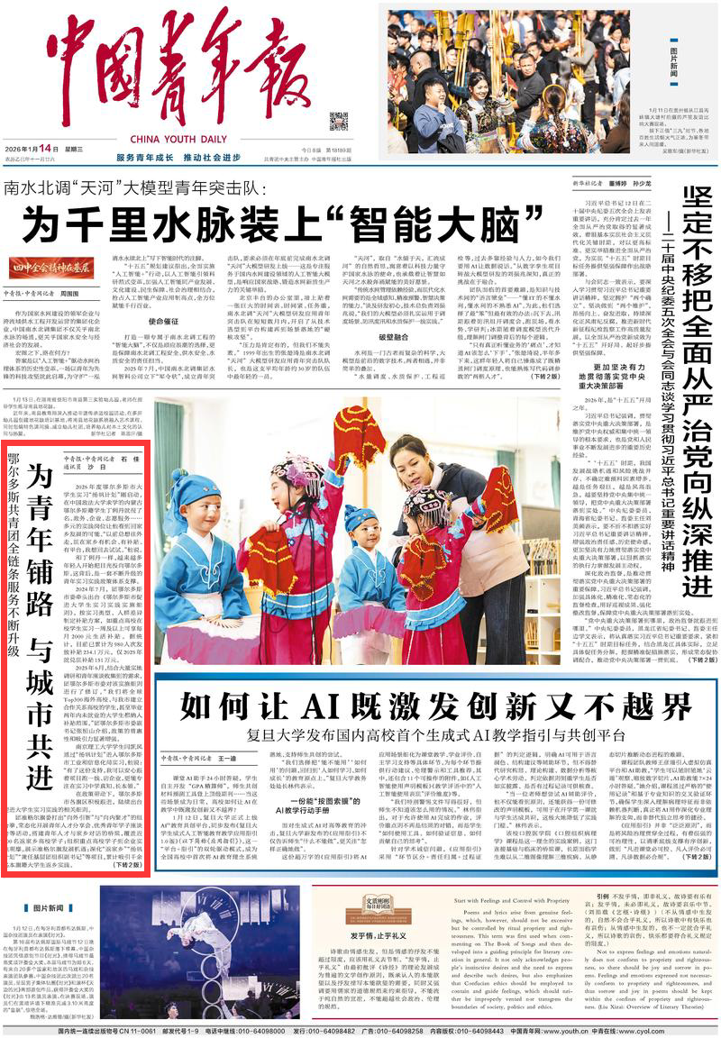2026年1月14日,《中國青年報》頭版刊發(fā)題為《鄂爾多斯共青團全鏈條服務(wù)不斷升級 為青年鋪路 與城市共進》的文章,報道了2024年7月,團鄂爾多斯市委牽頭出臺《鄂爾多斯市促進大學(xué)生實習(xí)實踐實施細則》,按實習(xí)類型、人群差異制定補貼方案。2025年6月,結(jié)合大量實地調(diào)研和青年座談收集到的需求,團鄂爾多斯市委對該實施細則進行了修訂。在政策帶動下,鄂爾多斯市各旗區(qū)積極跟進,陸續(xù)出臺促進大學(xué)生實習(xí)實踐的相關(guān)細則。