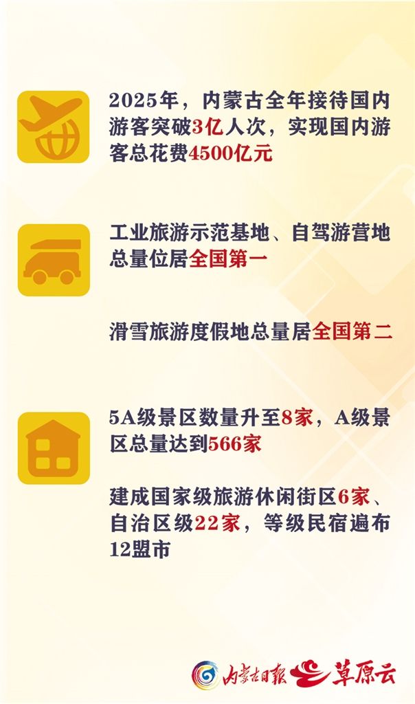 數(shù)據(jù)說話,最有分量。2025年,內(nèi)蒙古全年接待國(guó)內(nèi)游客突破3億人次,實(shí)現(xiàn)國(guó)內(nèi)游客總花費(fèi)4500億元。