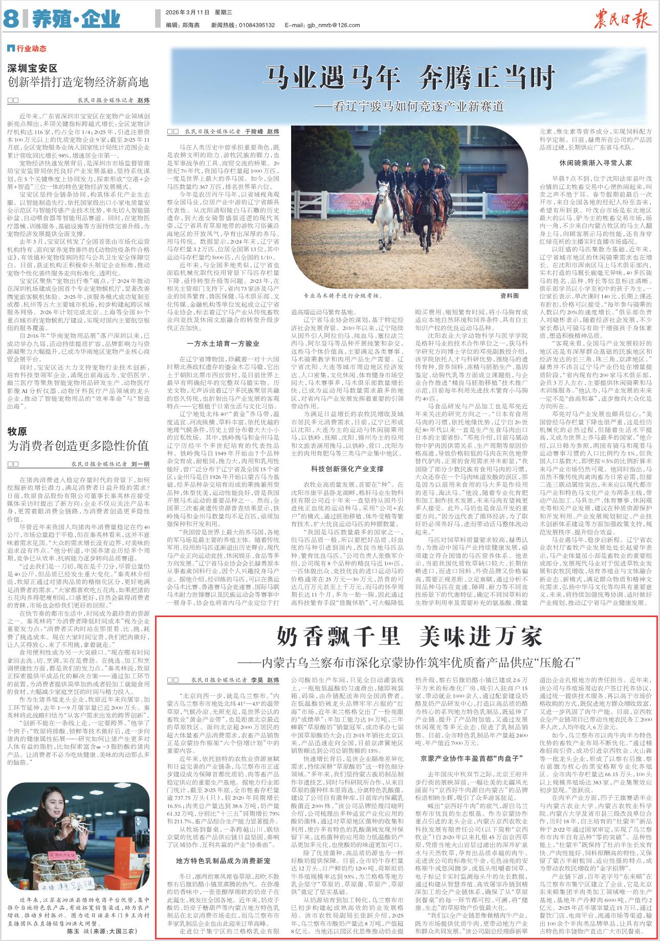 2026年3月11日,《農(nóng)民日報》第8版刊發(fā)題為《奶香飄千里 美味進萬家——內(nèi)蒙古烏蘭察布市深化京蒙協(xié)作筑牢優(yōu)質(zhì)畜產(chǎn)品供應(yīng)“壓艙石”》的文章,報道了內(nèi)蒙古烏蘭察布市是世界公認(rèn)的畜牧業(yè)“黃金產(chǎn)業(yè)帶”,也是距離北京最近的草原牧區(qū),面向北京超2000萬居民的超大體量畜產(chǎn)品消費需求,農(nóng)畜產(chǎn)品銷售正是京蒙協(xié)作框架“六個倍增計劃”中的重要內(nèi)容。
