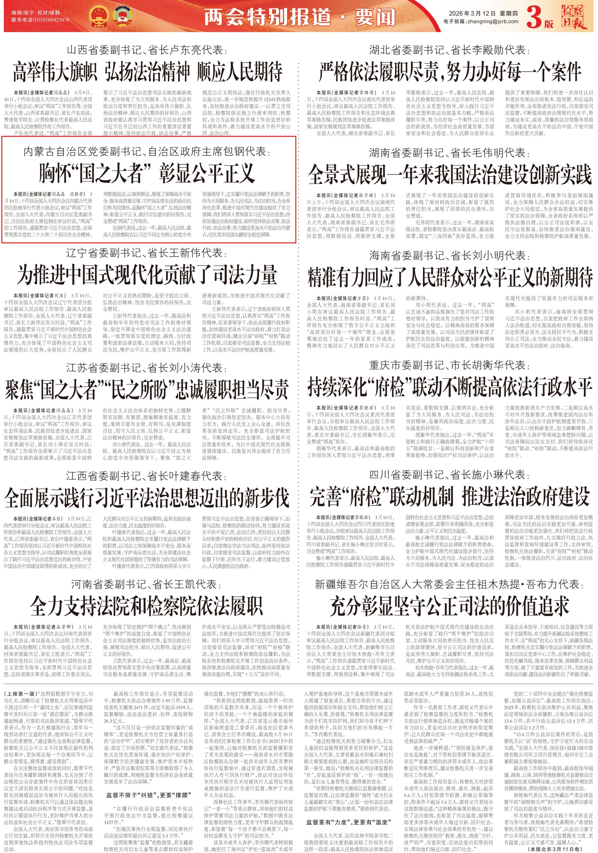 2026年3月11日《檢察日報》第3版刊發(fā)了《內蒙古自治區(qū)黨委副書記、自治區(qū)政府主席包鋼代表: 胸懷“國之大者” 彰顯公平正義 》的文章,報道了十四屆全國人大四次會議內蒙古代表團在駐地舉行代表小組會議,審議“兩高”工作報告。全國人大代表,內蒙古自治區(qū)黨委副書記、自治區(qū)政府主席包鋼在審議時說,“兩高”的工作報告,通篇貫穿習近平法治思想,全面貫徹落實黨的二十大和二十屆歷次全會精神,用數(shù)據(jù)說話,以案例釋法,展現(xiàn)了保障高水平安全、服務高質量發(fā)展、守護高品質生活的政治站位和為民情懷,是胸懷“國之大者”、弘揚法治精神、彰顯公平正義、踐行宗旨意識的好報告,完全贊成“兩高”工作報告。