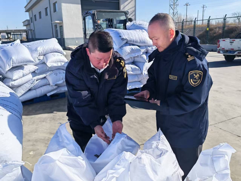 集寧海關(guān)關(guān)員對出口葵花籽進行現(xiàn)場查驗