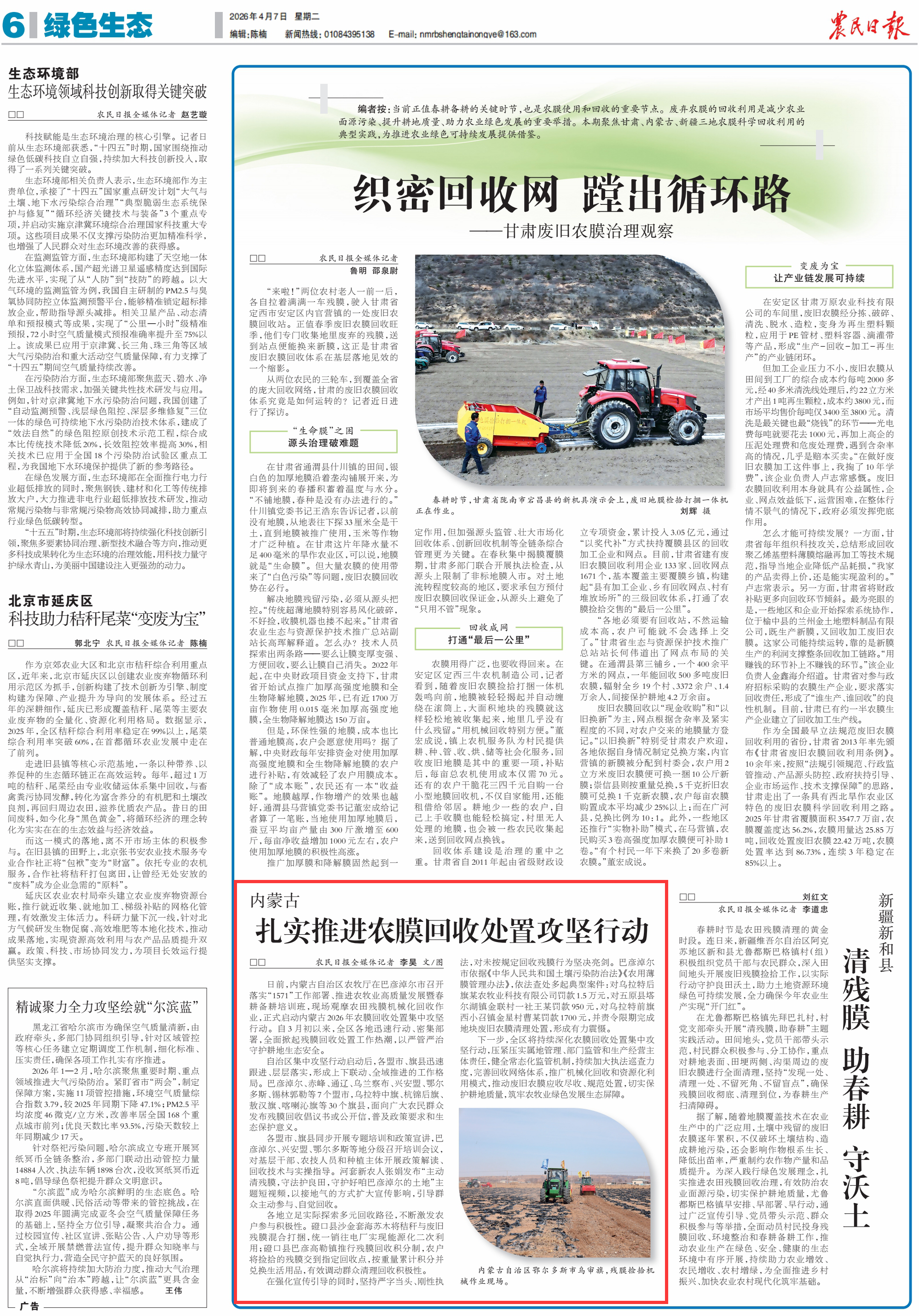 2026年4月7日,《農(nóng)民日報》第6版刊發(fā)題為《內(nèi)蒙古扎實(shí)推進(jìn)農(nóng)膜回收處置攻堅(jiān)行動》的文章,報道了日前,內(nèi)蒙古自治區(qū)農(nóng)牧廳在巴彥淖爾市召開落實(shí)“1571”工作部署、推進(jìn)農(nóng)牧業(yè)高質(zhì)量發(fā)展暨春耕備耕培訓(xùn)班,現(xiàn)場觀摩農(nóng)田殘膜機(jī)械化回收作業(yè),正式啟動內(nèi)蒙古2026年農(nóng)膜回收處置集中攻堅(jiān)行動。自3月初以來,全區(qū)各地迅速行動、密集部署,全面掀起殘膜回收處置工作熱潮,以嚴(yán)管嚴(yán)治守護(hù)耕地生態(tài)安全。
