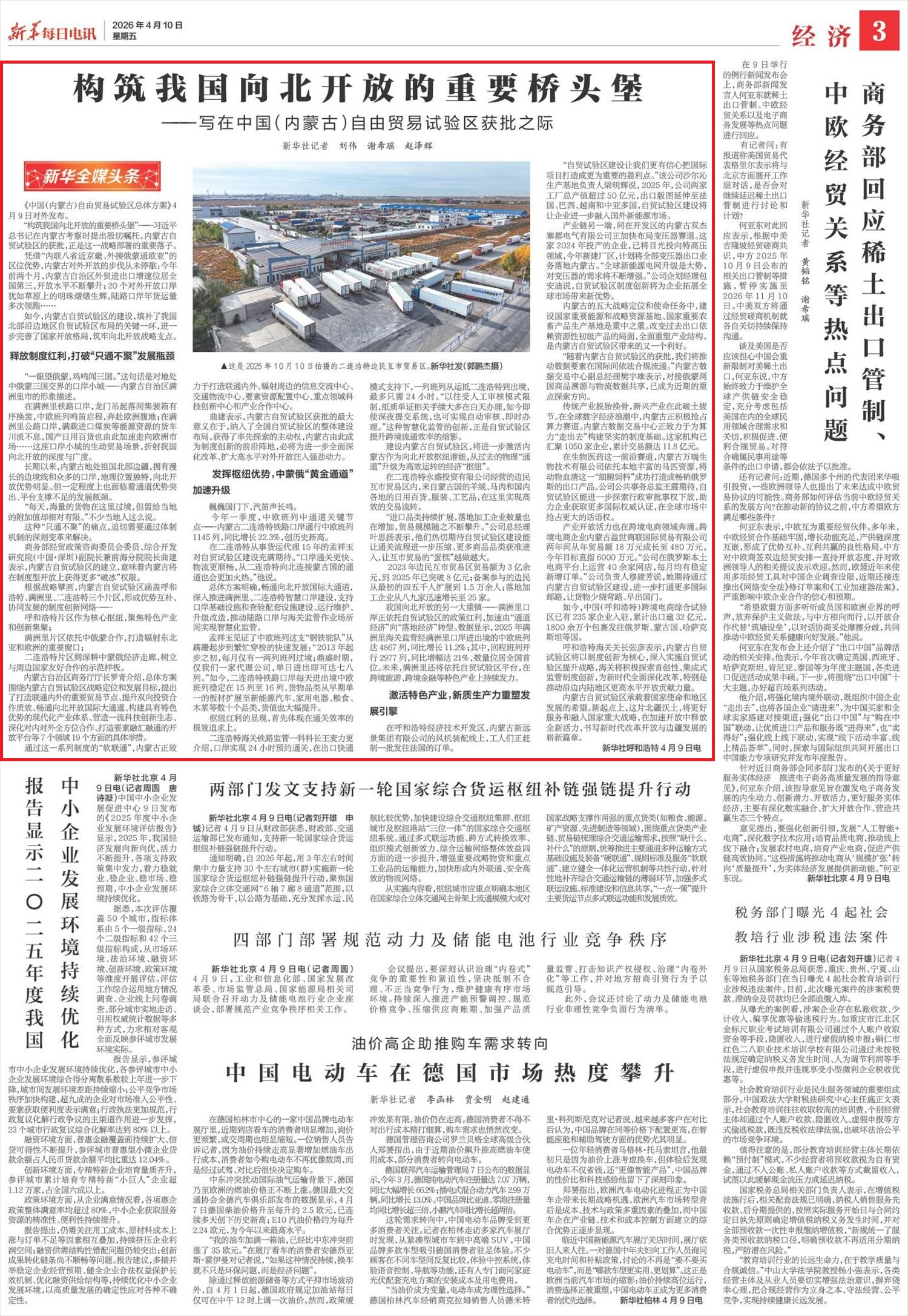 2026年4月10日,《新華每日電訊》第3版刊發(fā)題為《構(gòu)筑我國(guó)向北開放的重要橋頭堡——寫在中國(guó)(內(nèi)蒙古)自由貿(mào)易試驗(yàn)區(qū)獲批之際》的文章,報(bào)道了《中國(guó)(內(nèi)蒙古)自由貿(mào)易試驗(yàn)區(qū)總體方案》4月9日對(duì)外發(fā)布。內(nèi)蒙古自貿(mào)試驗(yàn)區(qū)的建設(shè),填補(bǔ)了我國(guó)北部沿邊地區(qū)自貿(mào)試驗(yàn)區(qū)布局的關(guān)鍵一環(huán),進(jìn)一步完善了國(guó)家開放格局,筑牢向北開放戰(zhàn)略支點(diǎn)。