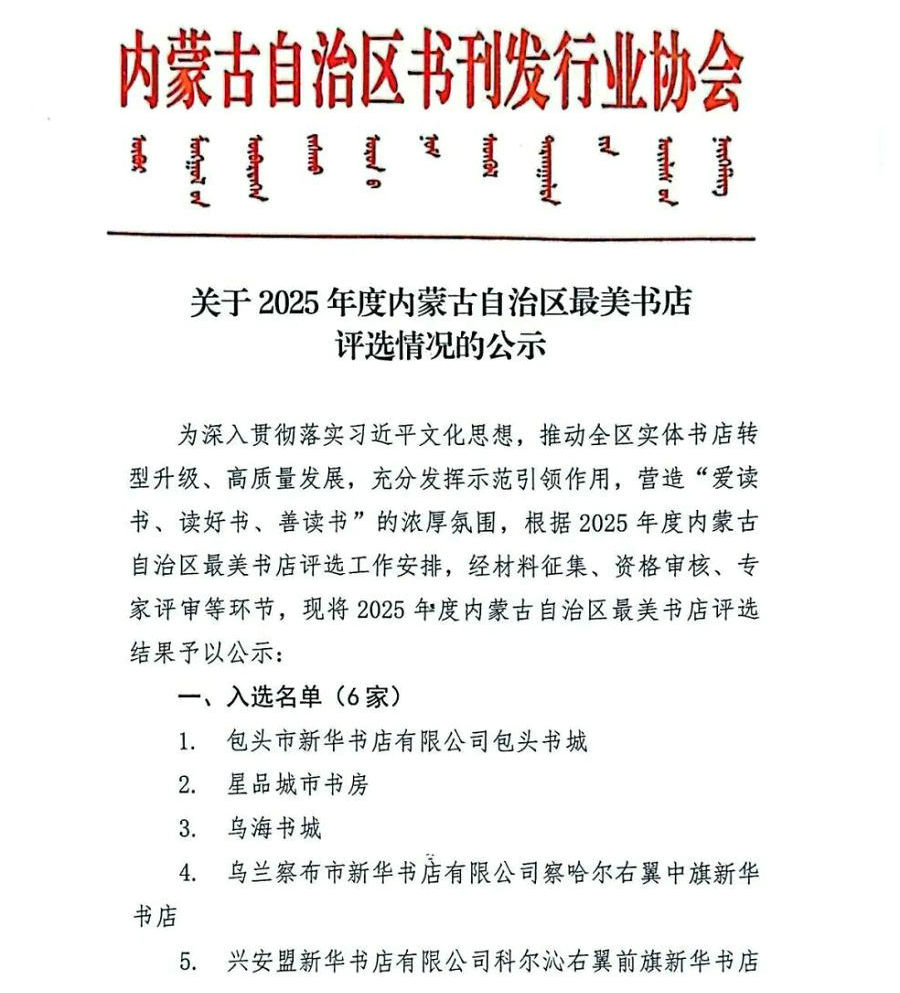 為深入貫徹落實(shí)習(xí)近平文化思想,推動(dòng)全區(qū)實(shí)體書店轉(zhuǎn)型升級(jí)、高質(zhì)量發(fā)展,充分發(fā)揮示范引領(lǐng)作用,營(yíng)造“愛(ài)讀書、讀好書、善讀書”的濃厚氛圍,根據(jù)2025年度內(nèi)蒙古自治區(qū)最美書店評(píng)選工作安排,經(jīng)材料征集、資格審核、專家評(píng)審等環(huán)節(jié),現(xiàn)將2025年度內(nèi)蒙古自治區(qū)最美書店評(píng)選結(jié)果予以公示: