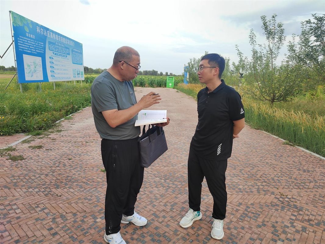 高潤紅(左一)在通遼調(diào)研高標(biāo)準(zhǔn)農(nóng)田時與工作人員交流。