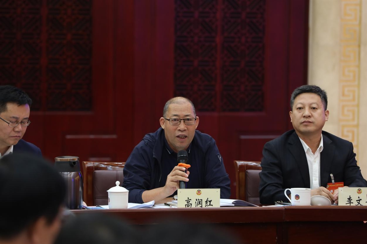 高潤紅(中)在自治區(qū)政協(xié)第十三屆常委會第四次會議高標(biāo)準(zhǔn)農(nóng)田會議發(fā)言。