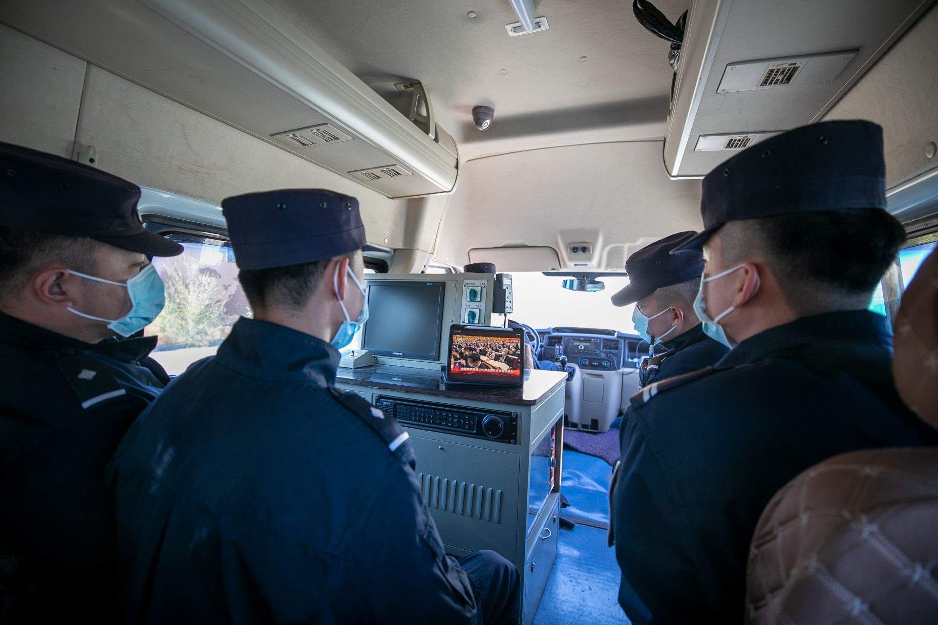 二連出入境邊防檢查站民警收看黨的二十大開幕會。郭鵬杰攝